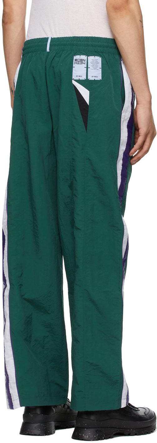 Relaxed-fit nylon taffeta lounge pants in green. High-rise. Taffeta trim in white, purple, and black, and piping in purple throughout. Two-pocket styling. Concealed drawstring at elasticized waistband. Logo flag in purple and textile logo patches in purple at back waistband. Mock-fly. Part of the Eden High collection. Supplier color: Varsity Green Body: 100% polyamide. Trim: 100% polyester. Brand: MCQ