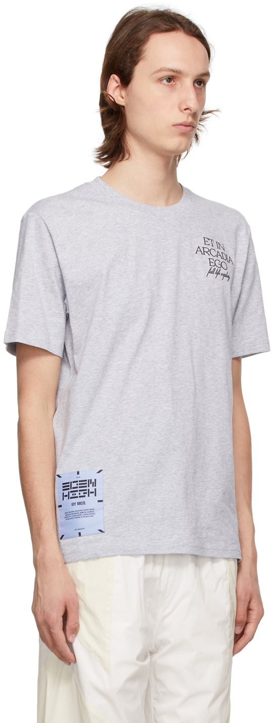 Short sleeve cotton jersey T-shirt in grey. Rib knit crewneck collar. Text printed in black at chest. Textile logo patch in purple at front hem. Textile flag in purple at back collar. Text and graphic printed in black at back. Part of the Eden High collection. Supplier color: Grey mélange Body: 100% cotton. Trim: 100% polyester. Brand: MCQ