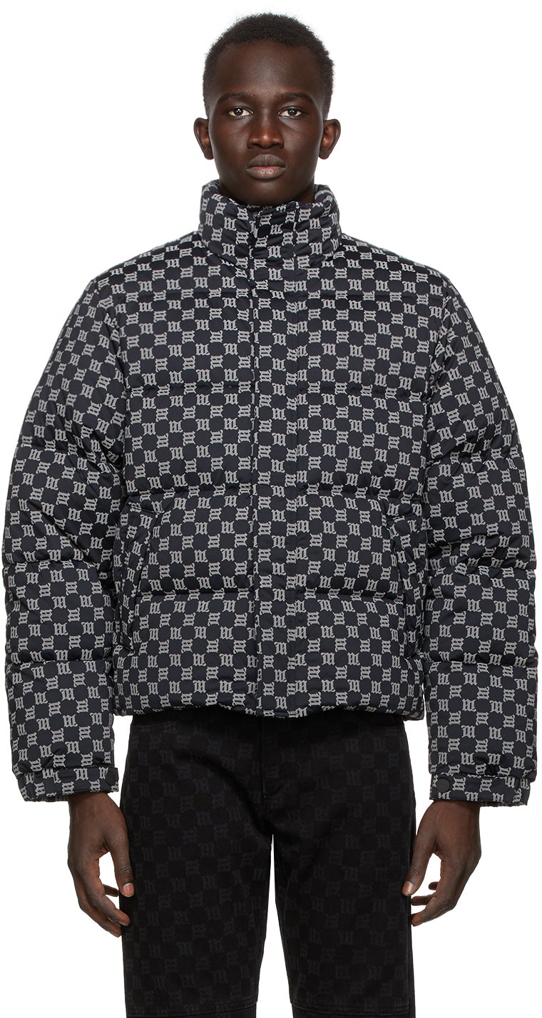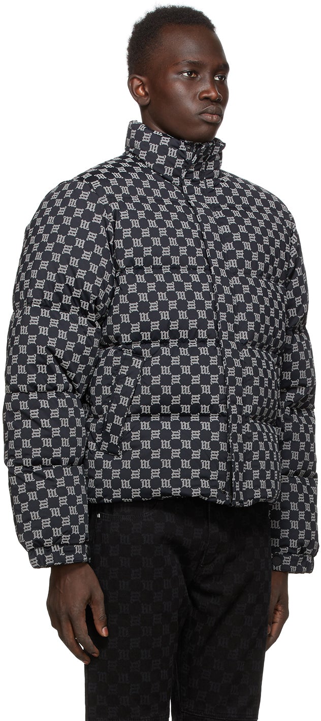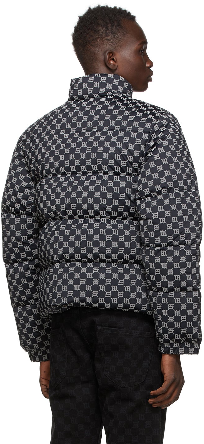 Long sleeve quilted padded jacket in black featuring logo pattern in reflective grey throughout. Stand collar. Zip and press stud closure at front. Welt pockets at waist. Adjustable press-stud tab at cuffs. Tonal satin lining. Fully lined. Tonal hardware. Supplier color: Black Body: 78% polyamide, 22% elastane. Lining: 100% viscose. Brand: MISBHV