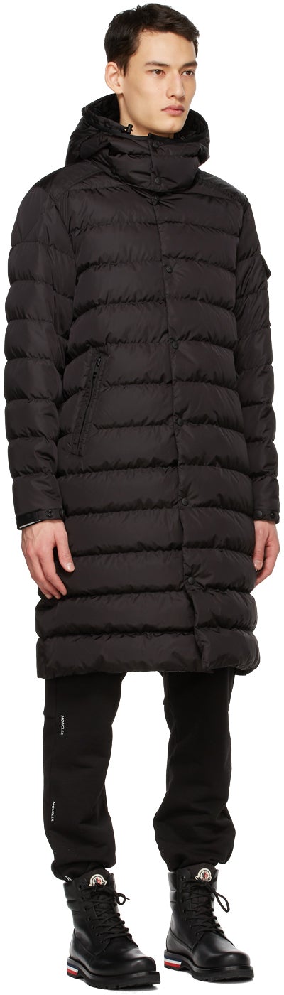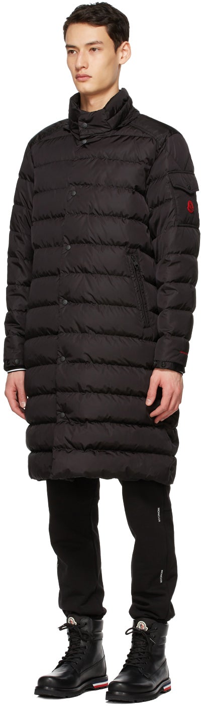 Long sleeve down-filled quilted ECONYL® nylon coat in black. Bungee-style drawstring at detachable hood with press-stud fastening. Concealed two-way zip closure and press-stud placket at front. Zippered pockets at waist. Flap pocket, felted logo patch, and embroidered logo in red at sleeve. Adjustable press-stud tab at cuffs. Zippered pocket at interior. Fully lined. Tonal hardware. Part of the Born To Protect capsule collection. Supplier color: Black Fill: 90% duck down, 10% feathers. Body: 100% recycled nylon. Lining: 100% recycled nylon. Brand: Moncler