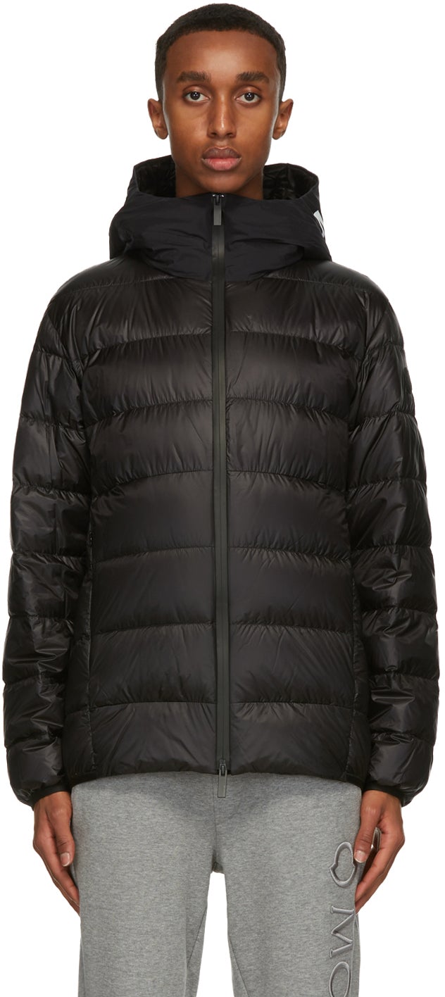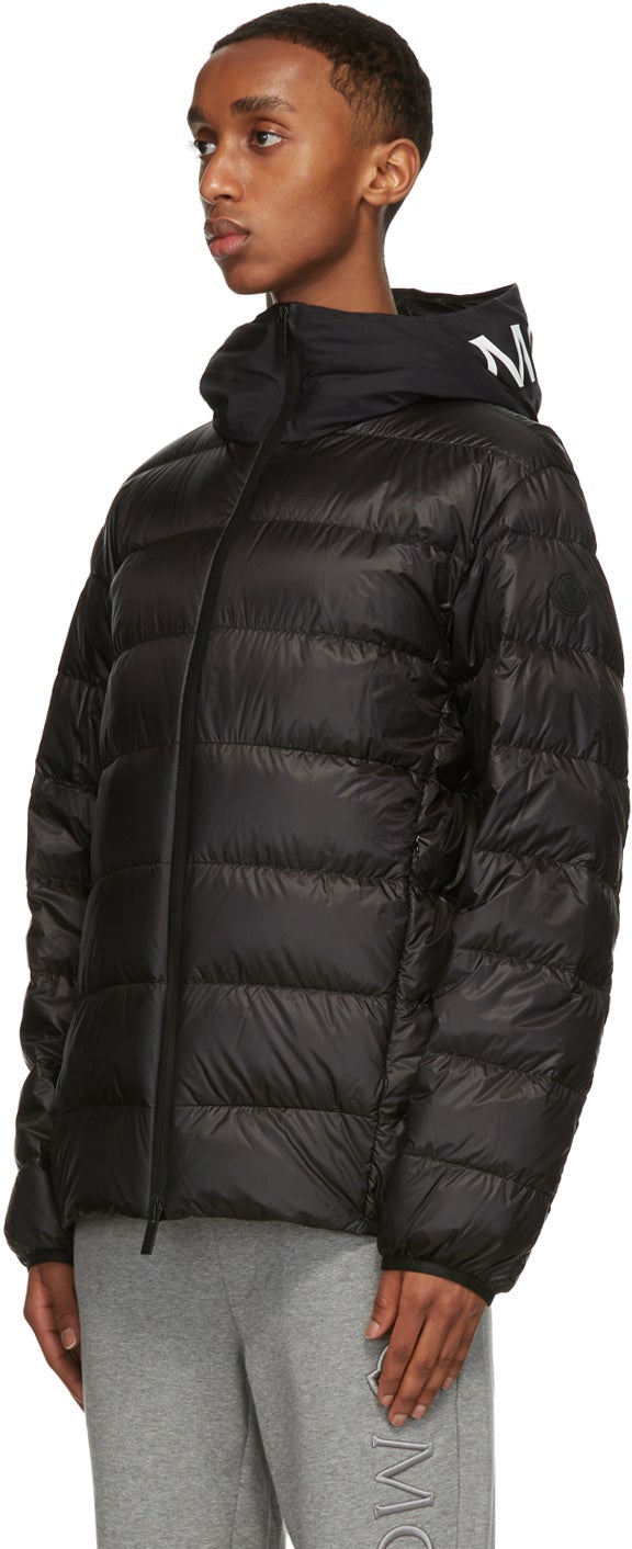 Long sleeve down-filled quilted nylon satin jacket in black. Logo printed in white at hood. Two-way zip closure at front. Concealed zippered pockets at waist. Tonal rubberized logo patch at sleeve. Elasticized cuffs and hem. Tonal lining. Fully lined. Tonal logo-engraved hardware. Supplier color: Black Fill: 90% down, 10% feather. Body: 100% polyamide. Brand: Moncler