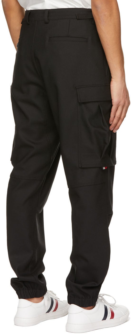 Relaxed-fit paneled stretch virgin wool-blend twill cargo pants in black. Mid-rise. Four-pocket styling. Belt loops and cinch straps at waistband. Pleats at knees. Tonal rubberized logo patch and textile logo flag in red, white, and blue at outseam. Flap and zippered pocket at mismatching outseams. Elasticized cuffs. Zip-fly. Logo-engraved tonal hardware. Supplier color: Black 53% virgin wool, 41% polyamide, 6% elastane. Brand: Moncler