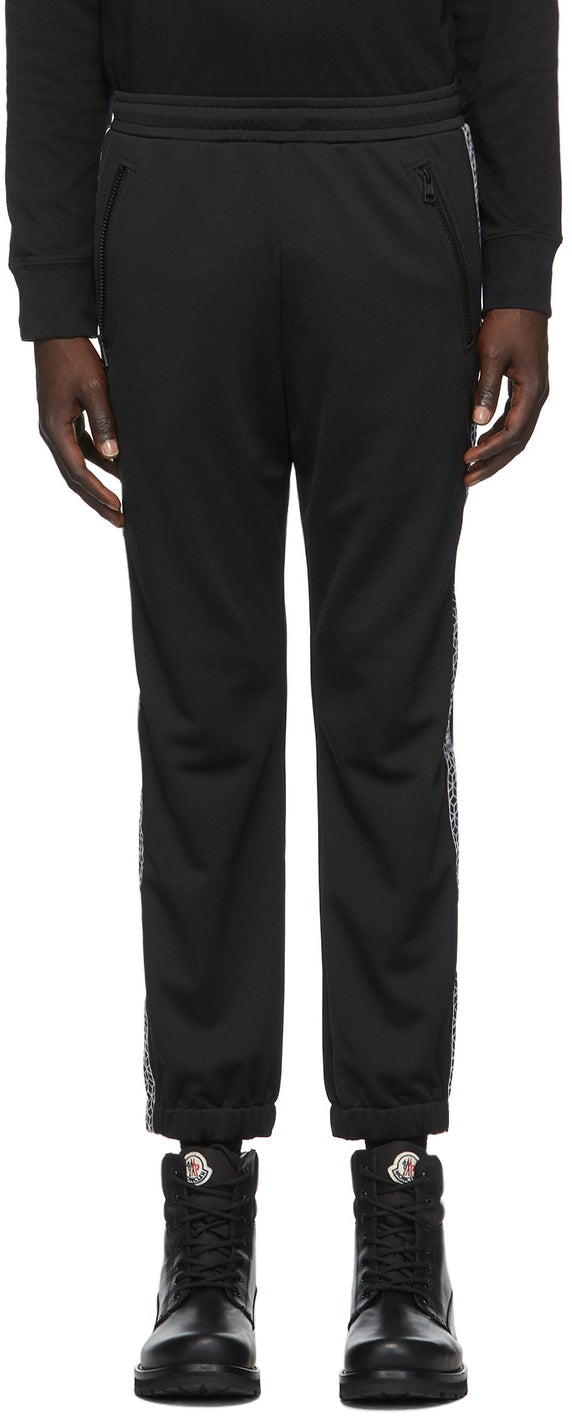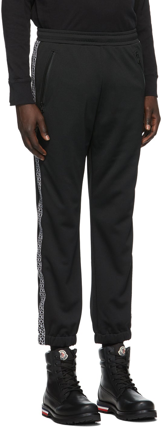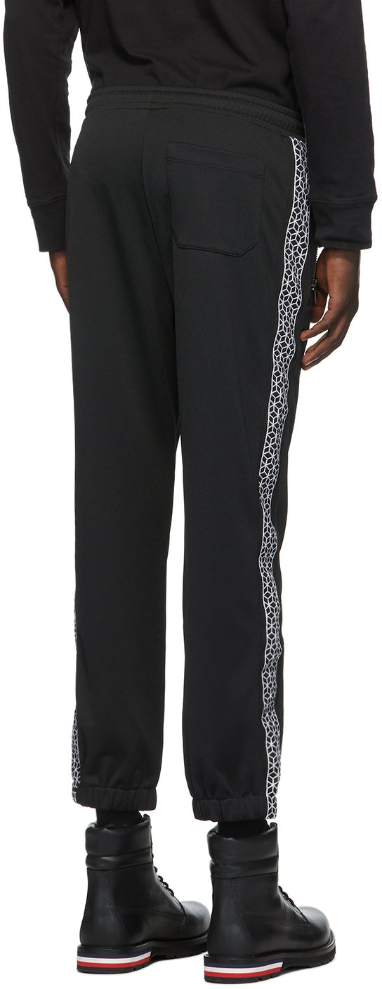 Slim-fit trousers in black. Mid-rise. Three-pocket styling. Concealed drawstring at elasticized waistband. Graphic pattern embroidered in white at outseams. Elasticized cuffs. Tonal hardware. Part of the 7 Moncler FRGMT Hiroshi Fujiwara collection. Supplier color: Black 100% polyester. Brand: Moncler Genius