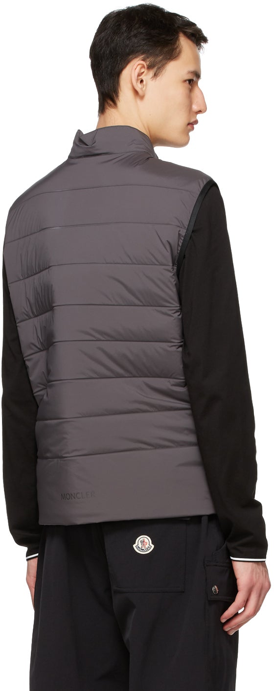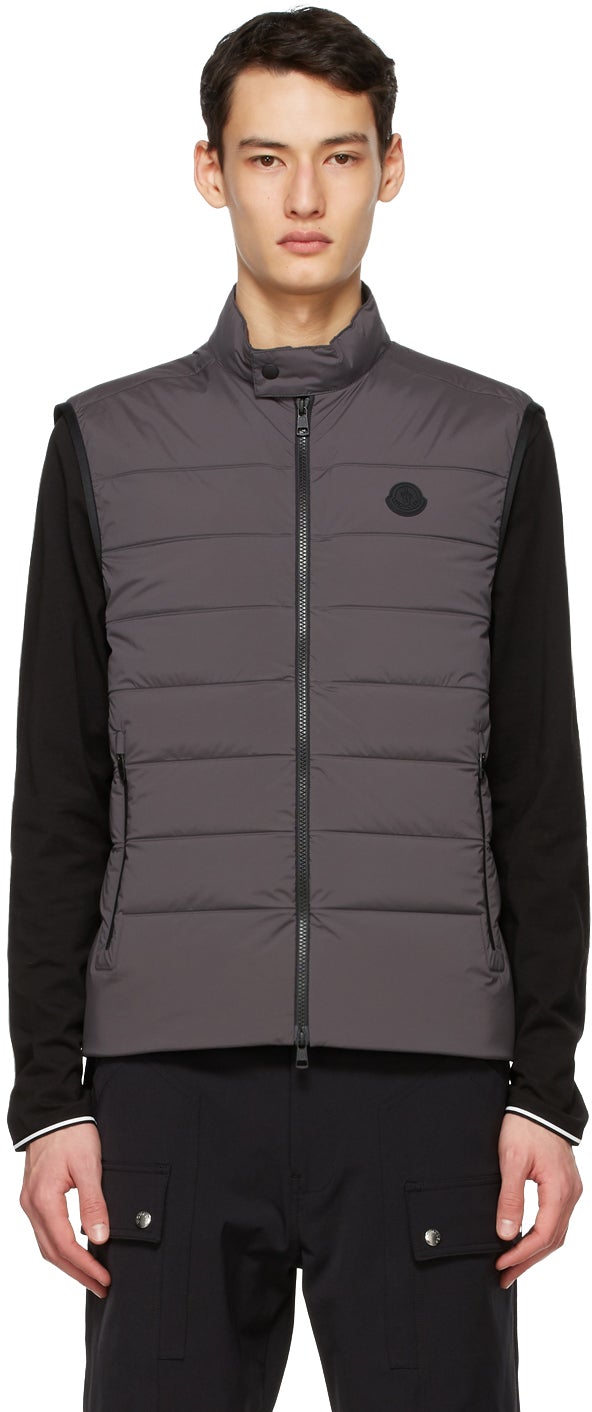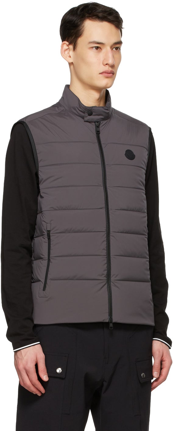 Sleeveless down-filled stretch nylon satin vest in grey. Press-stud tab at stand collar. Two-way zip closure at front. Rubberized logo appliqué in black at chest. Zippered pockets at waist. Concealed bungee-style drawstring at hem. Fully lined. Black logo-engraved hardware. Supplier color: Grey Fill: 90% goose down, 10% feathers. Body: 85% polyamide, 15% elastane. Lining: 85% polyamide, 15% elastane. Brand: Moncler