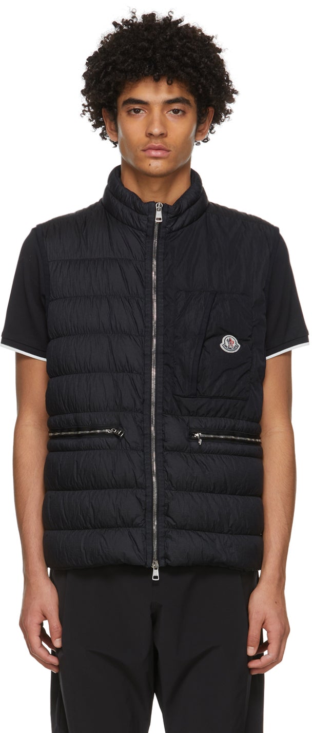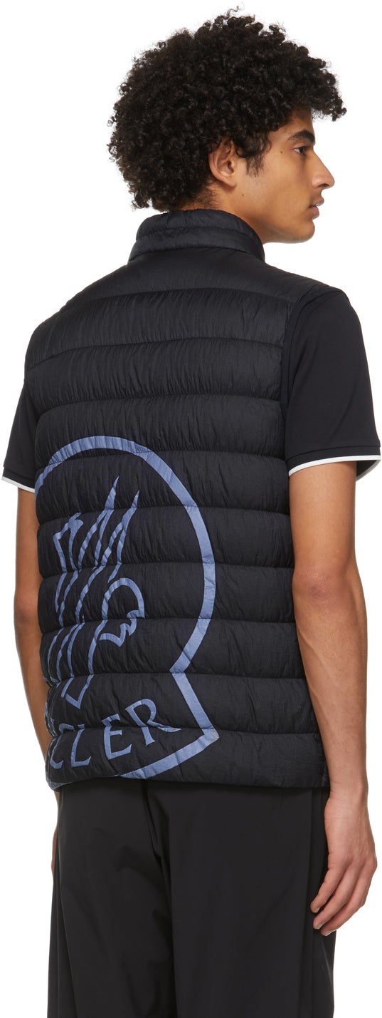 Sleeveless down-filled quilted crinkled nylon vest in navy. Stand collar. Two-way zip closure at front. Zippered pocket and tonal grosgrain trim featuring logo patch in white, blue, and red at chest. Zippered pockets at waist. Bungee-style drawstring at hem. Nylon taffeta logo appliqué in blue at back. Tonal grosgrain trim at armscyes. Logo-engraved silver-tone hardware. Supplier color: Navy Fill: 90% goose down, 10% feather. Body: 100% nylon. Brand: Moncler