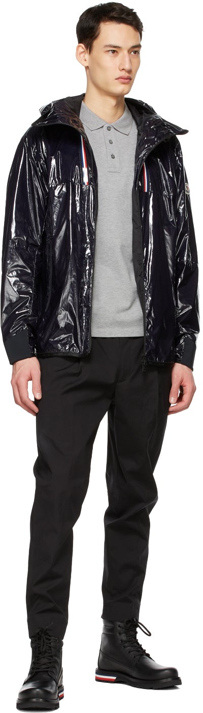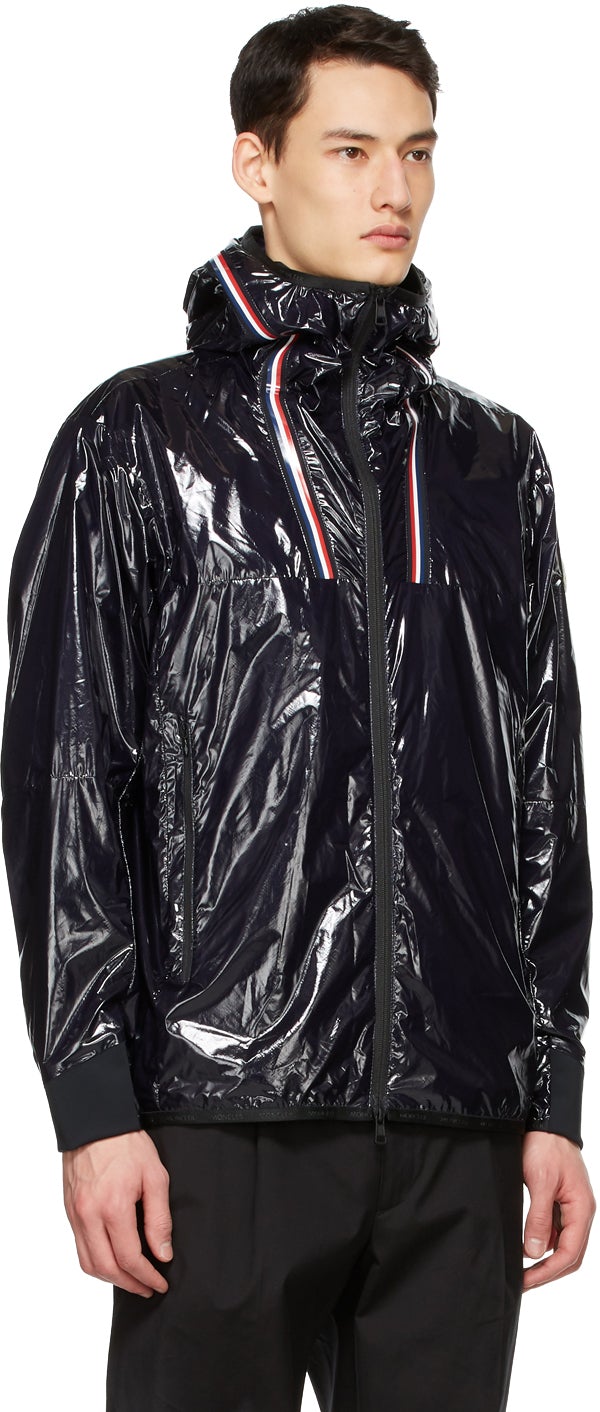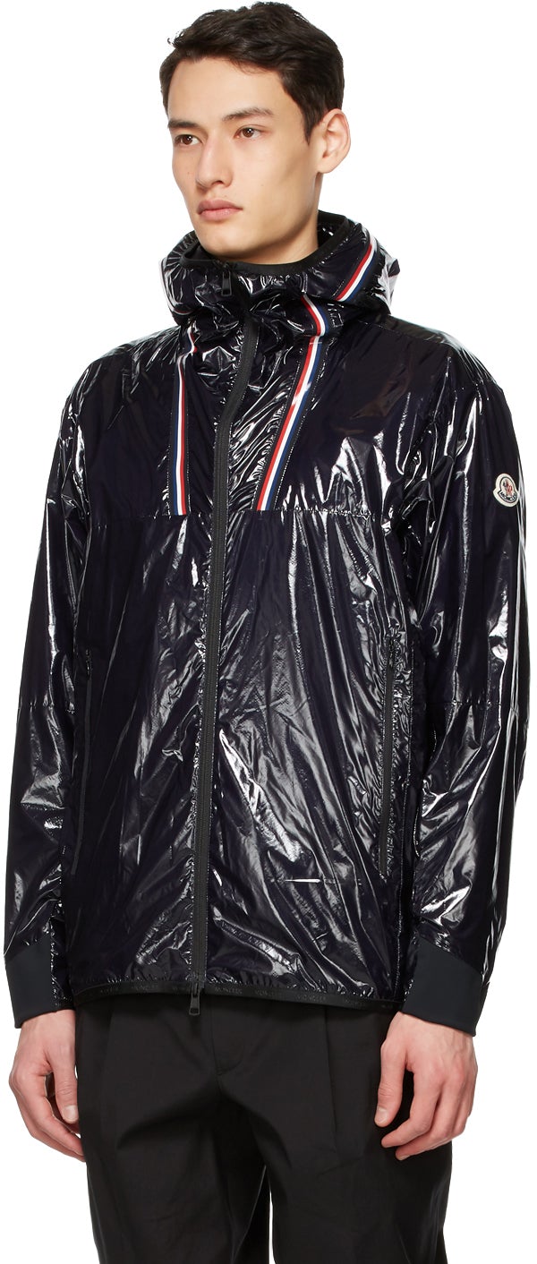 Long sleeve coated nylon ripstop jacket in navy featuring logo-woven webbing trim in black and rubberized tricolor trim throughout. Bungee-style drawstring at hood. Two-way zip closure at front. Zippered pockets at waist. Tricolor felted logo appliqué at sleeve. Bonded jersey trim in black at elasticized cuffs. Fully lined. Gunmetal-tone hardware. Supplier color: Night blue Body: 100% polyamide. Lining: 100% polyamide. Brand: Moncler