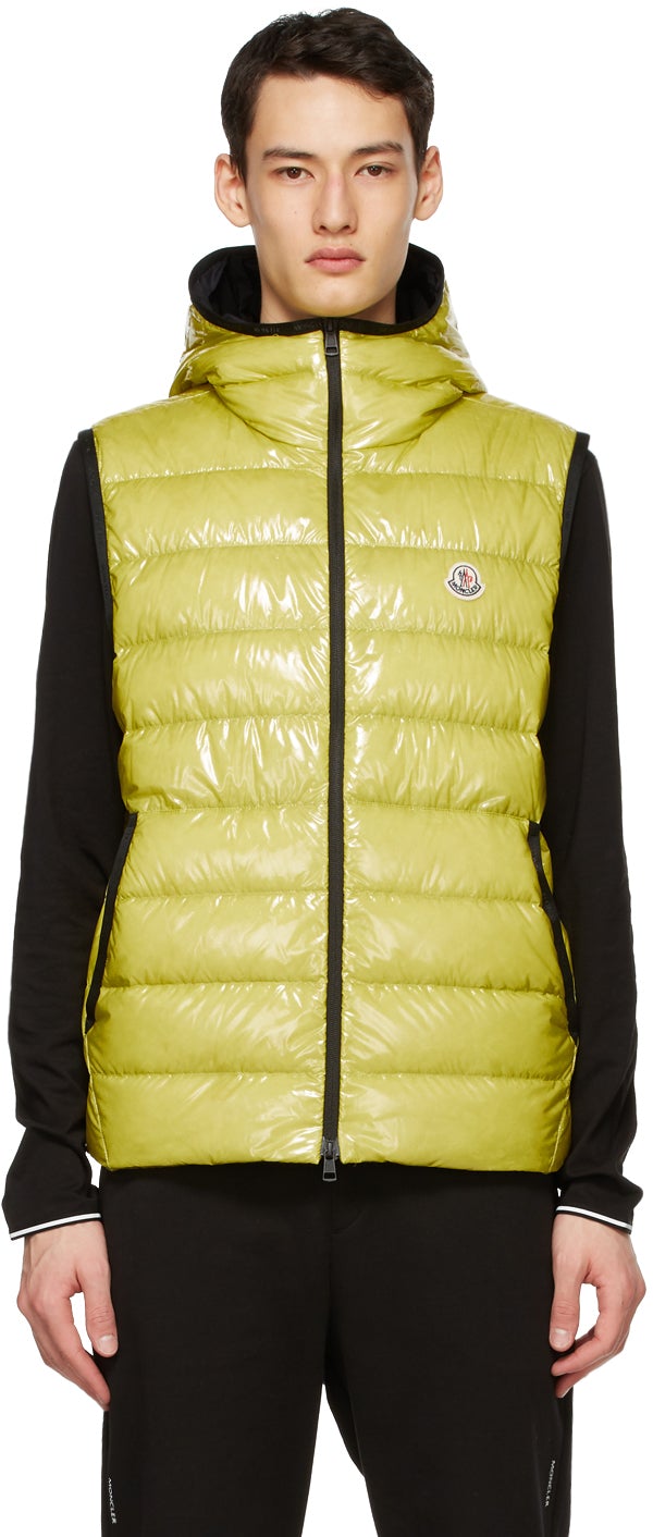 Sleeveless down-filled coated nylon ripstop vest in yellow featuring logo-woven webbing trim in black throughout. Two-way zip closure at front. Tricolor felted logo appliqué at chest. Zippered pockets at waist. Concealed bungee-style drawstring at hem. Tricolor rubberized appliqué at back hem. Fully lined. Black logo-engraved hardware. Supplier color: Mustard yellow Fill: 90% goose down, 10% feathers. Body: 100% polyamide. Lining: 100% polyamide. Brand: Moncler