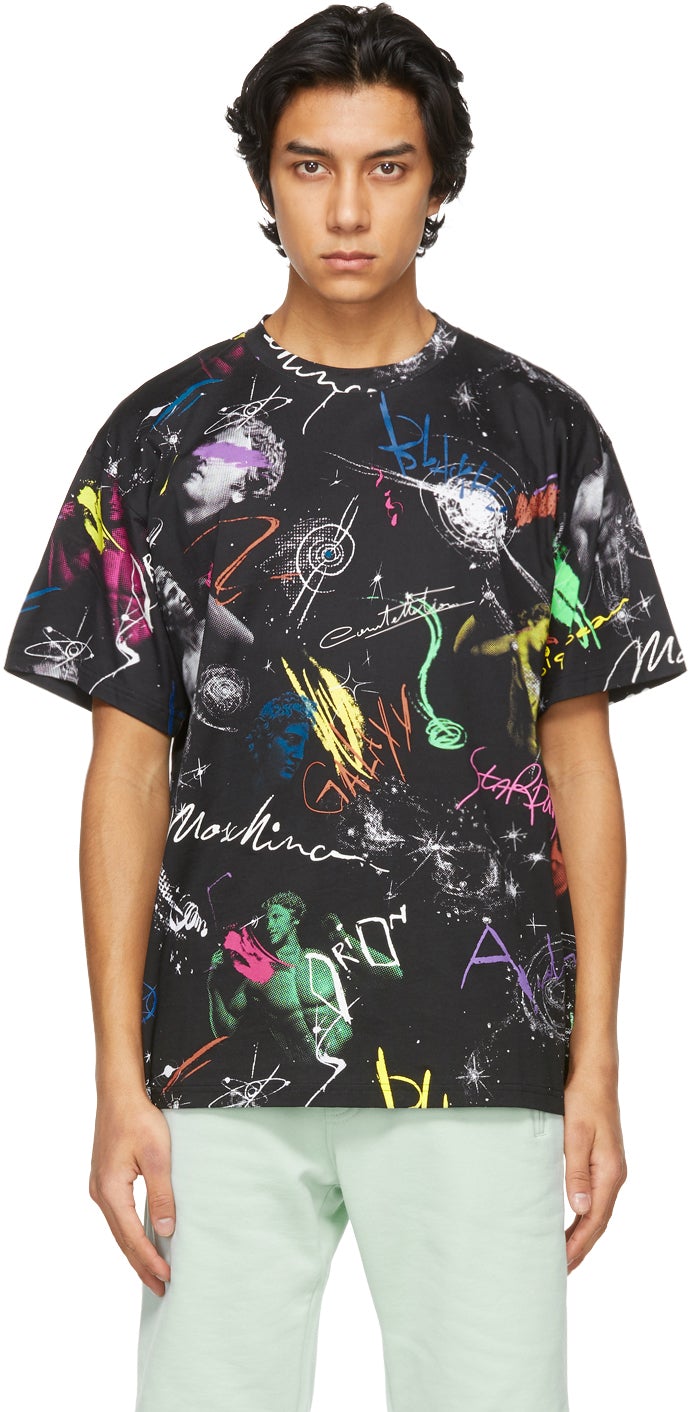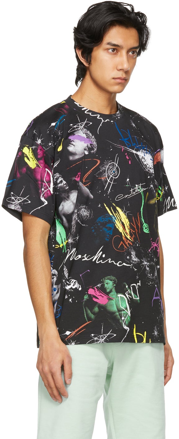 Short sleeve cotton jersey T-shirt in black featuring multicolor graphic pattern. Rib knit crewneck collar. Supplier color: Black 100% cotton. Brand: Moschino