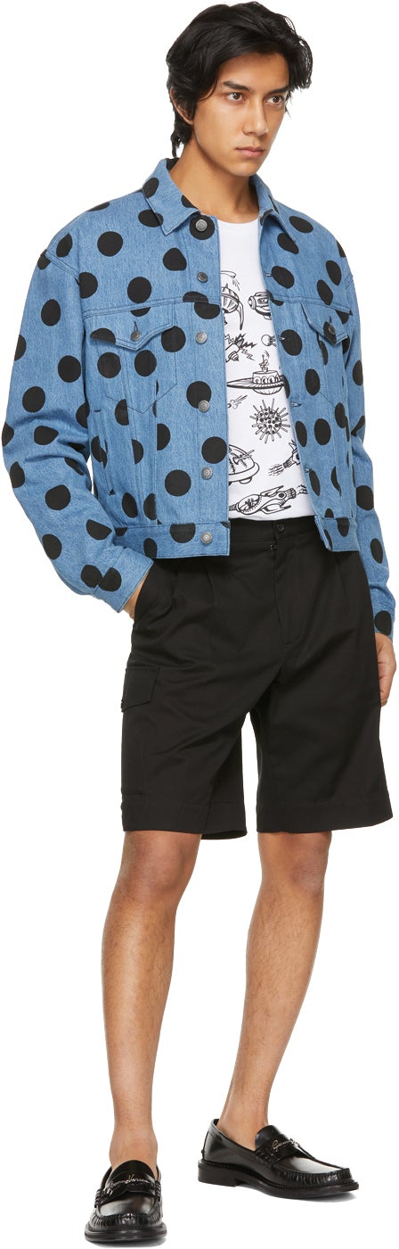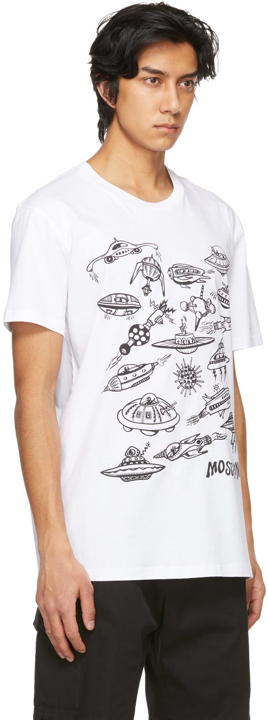Short sleeve cotton jersey T-shirt in white. Rib knit crewneck collar. Graphic printed in black at front. Supplier color: White 100% cotton. Brand: Moschino