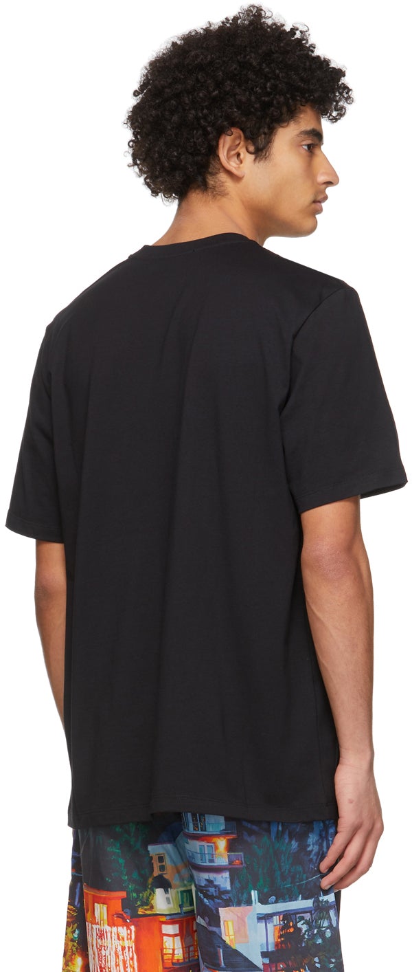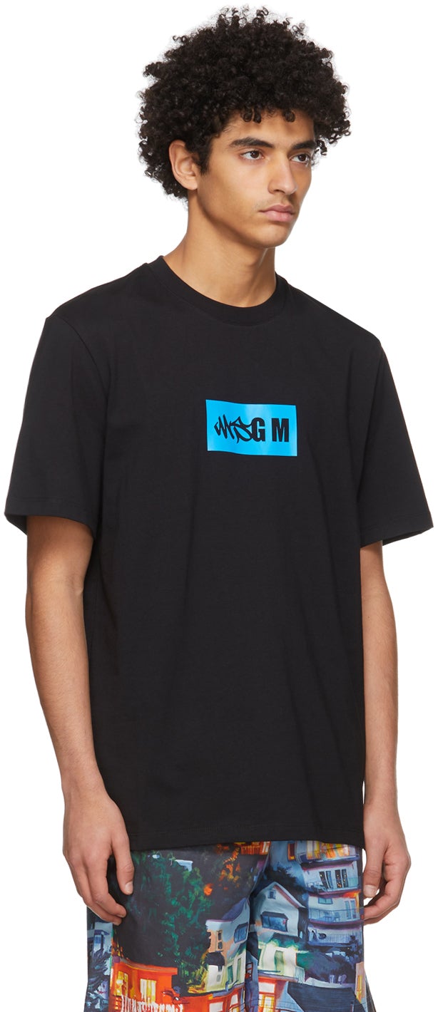 Short sleeve cotton jersey T-shirt in black. Rib knit crewneck collar. Logo printed in blue and black at chest. Supplier color: Black 100% cotton. Brand: MSGM