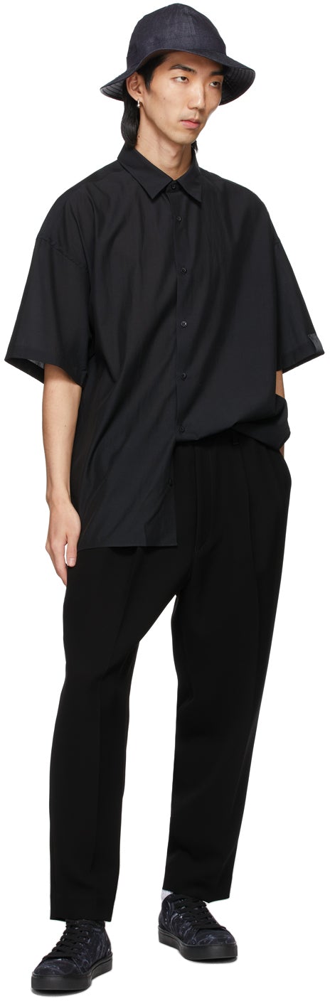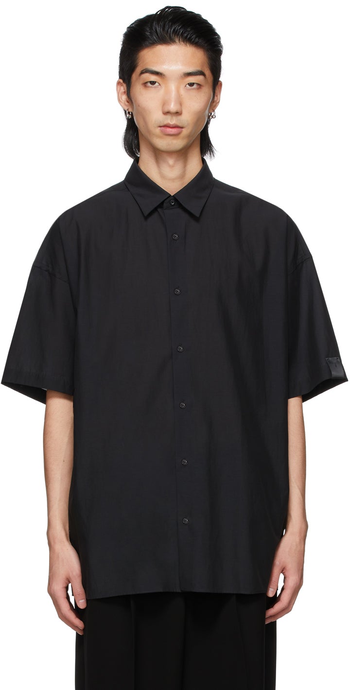 Half sleeve cupro and cotton-blend poplin shirt in black. Spread collar. Button closure at front. Inverted box pleat at back. Textile logo patch at cuff. Supplier color: Black 64% cupro, 36% cotton. Brand: N.Hoolywood