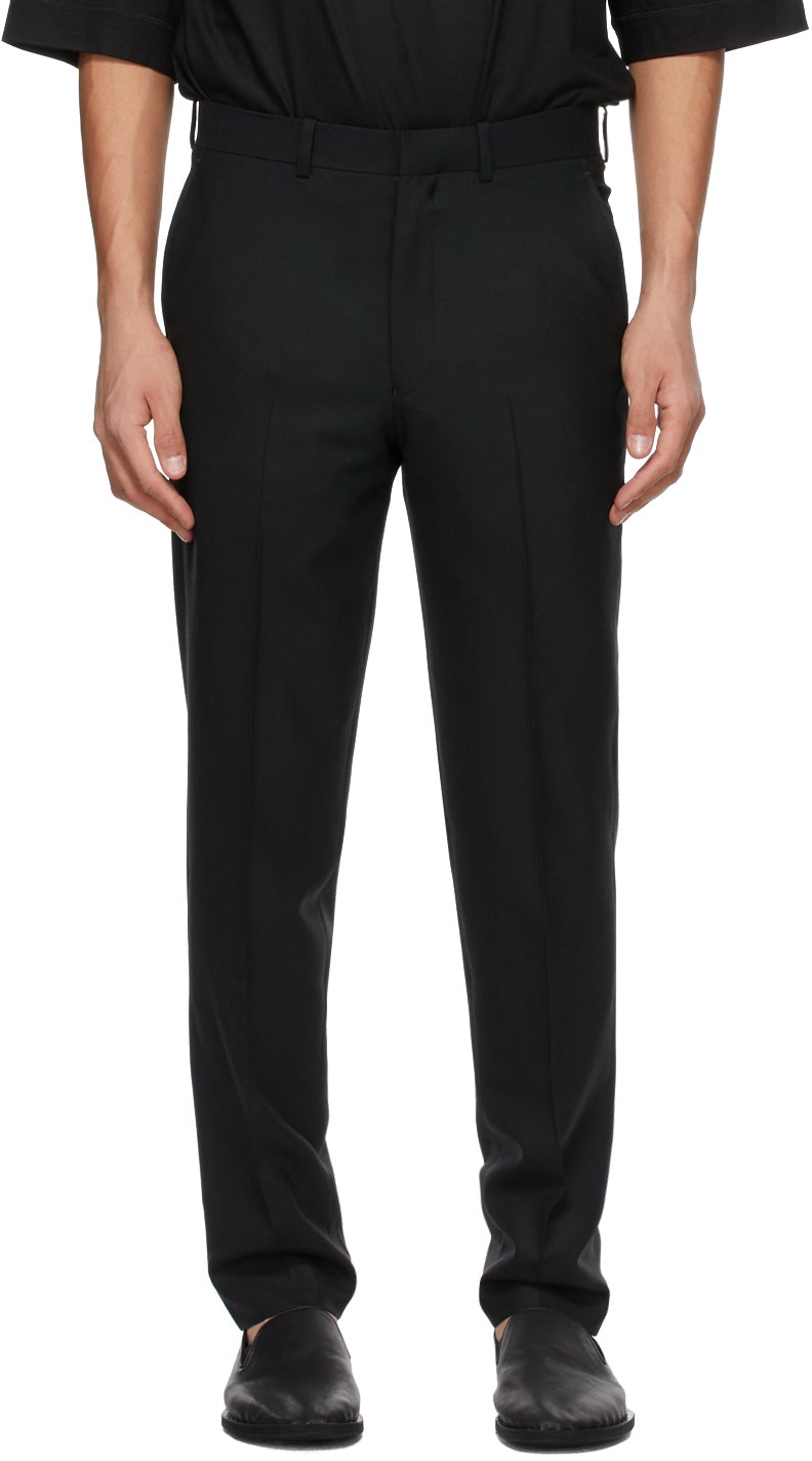 Tapered plain-woven wool trousers in black. Mid-rise. Four-pocket styling. Belt loops at waistband. Central crease at front and back legs. Tonal textile logo patch at back pocket. Unfinished hem. Zip-fly. Tonal hardware. Supplier color: Black Body: 100% wool. Trim: 100% polyester. Brand: N.Hoolywood