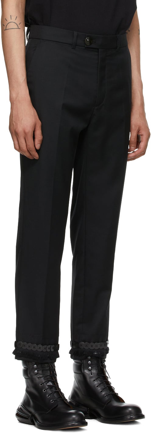 Straight-leg virgin wool twill trousers in black. Mid-rise. Four-pocket styling. Belt loops at waistband. Central creases at front and back. Button and fringed detailing at cuffs. Full viscose-blend satin lining. Zip-fly. Tonal hardware. Supplier color: Black Body: 100% virgin wool. Trim: 100% cotton. Lining 1: 52% viscose, 48% polyester. Lining 2: 100% cotton. Brand: Namacheko