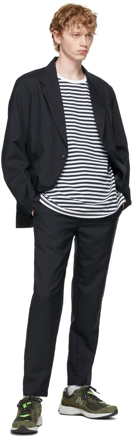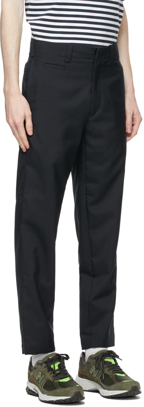 Tapered wool-blend twill trousers in navy. Mid-rise. Five-pocket styling. Concealed drawstring and belt loops at waistband. Press-stud pockets at back waistband. Zip-fly. Gunmetal-tone hardware. Supplier color: Navy 50% wool, 50% polyester. Brand: Nanamica