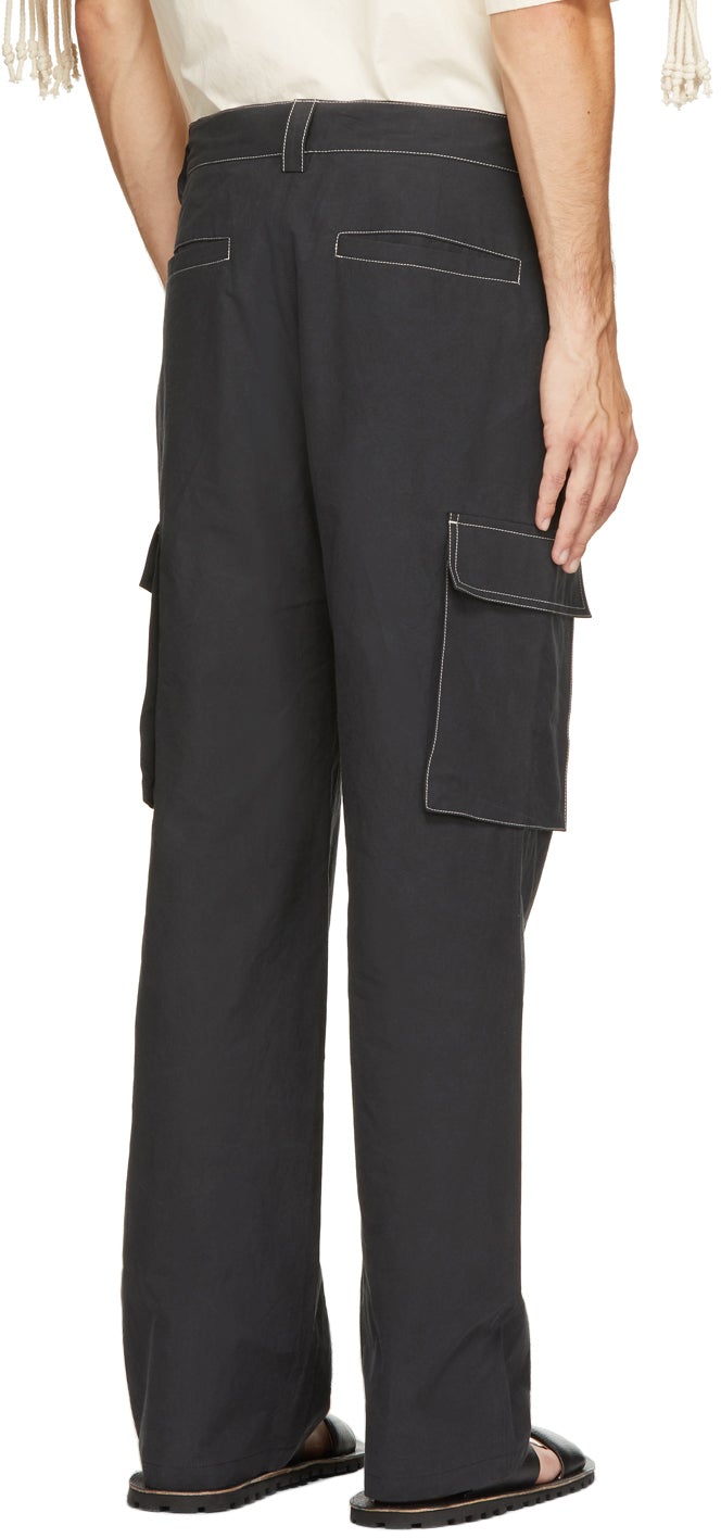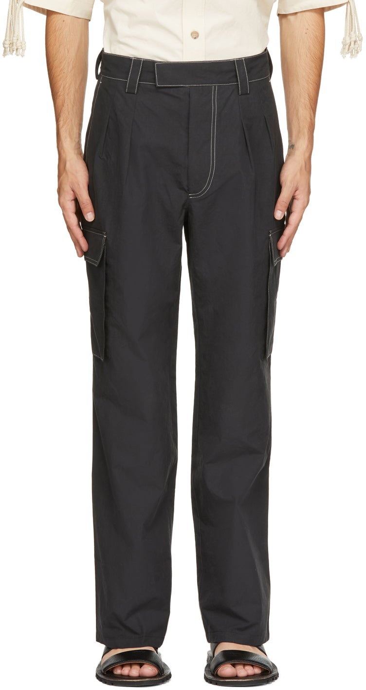 Relaxed-fit cotton poplin cargo pants in black. Mid-rise. Four-pocket styling. Belt loops at waistband. Pleats at front waistband. Flap pocket at knees. Button-fly. Tortoiseshell hardware. Contrast stitching in white. Supplier color: Black 100% cotton. Brand: Nanushka