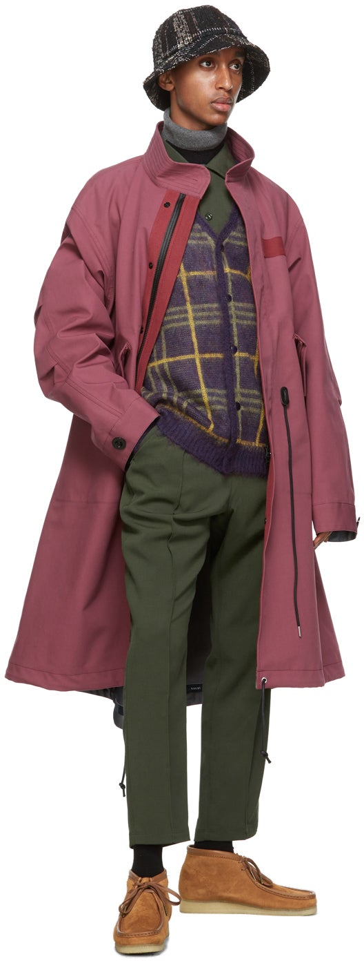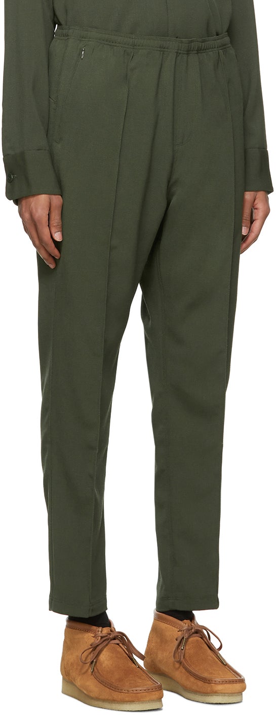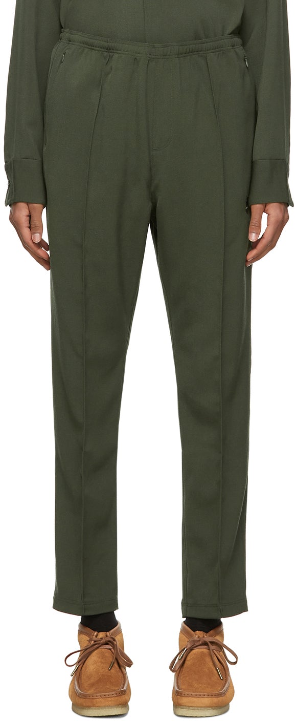 Tapered wool-blend twill track pants in khaki. Mid-rise. Four-pocket styling. Concealed drawstring at elasticized waistband. Pinched seams at front. Tonal graphic embroidered at front. Mock-fly. Tonal hardware. Supplier color: Olive Body: 70% polyester, 30% wool. Trim: 100% rayon. Brand: Needles