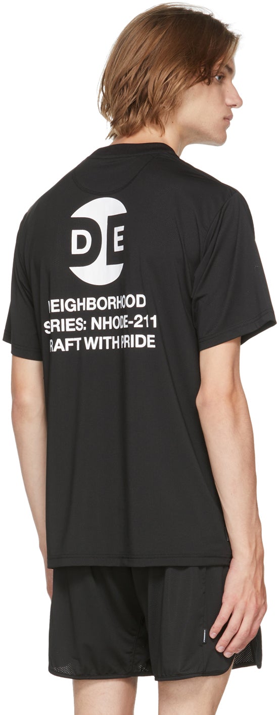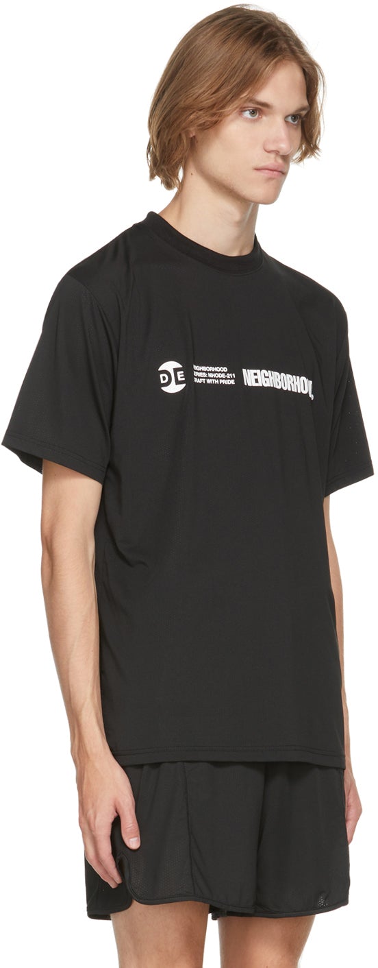 Short sleeve stretch nylon mesh T-shirt in black. Rib knit crewneck collar. Logo and text bonded in white at front and back. Textile logo flag at side seam. Supplier color: Black 90% polyester, 10% polyurethane. Brand: Neighborhood