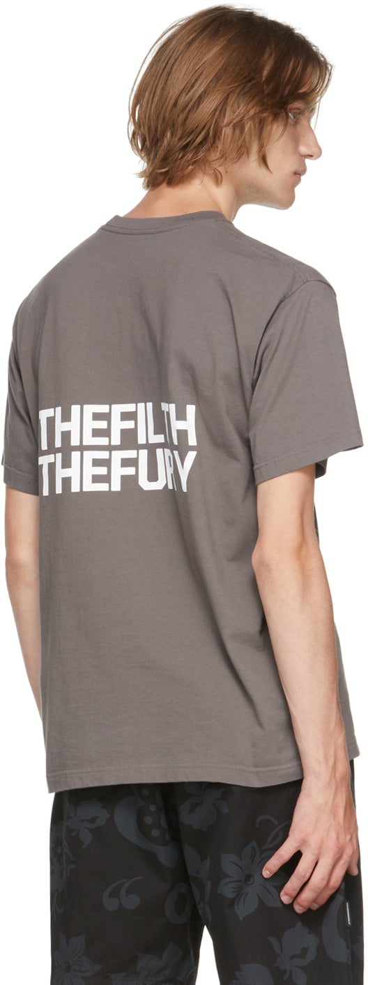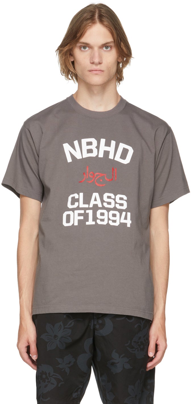 Short sleeve cotton jersey T-shirt in grey. Rib knit crewneck collar. Logo and text bonded in white and red at front and back. Supplier color: Gray 100% cotton. Brand: Neighborhood