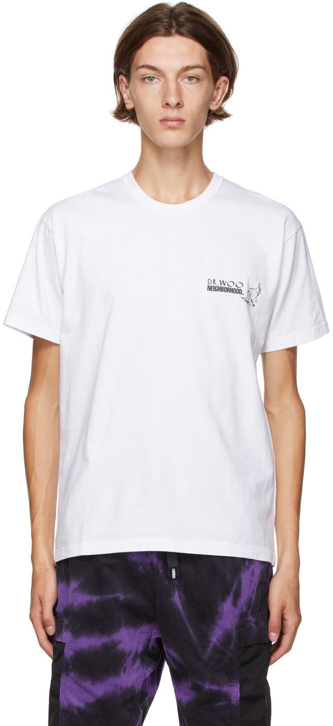 Short sleeve cotton jersey T-shirt in white. Rib knit crewneck collar. Logo graphic and text in black and bronze-tone at chest and back. Part of the Neighborhood x Dr. Woo collaboration. Supplier color: White 100% cotton. Brand: Neighborhood