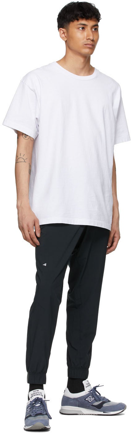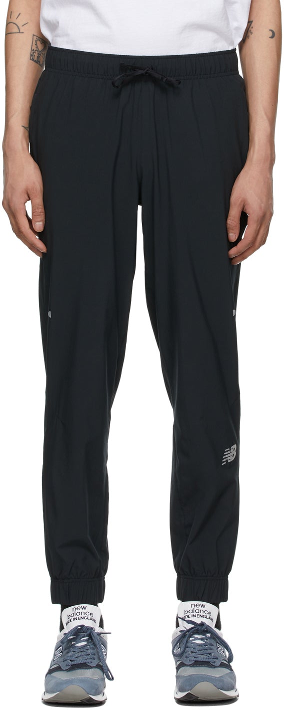 Relaxed-fit plain-woven stretch lounge pants in black. Mid-rise. Wind and water-resistant. Trim bonded in reflective silver-tone throughout. Three-pocket styling. Drawstring at elasticized waistband. Logo bonded in reflective silver-tone at front and back. Elasticized cuffs. Supplier color: Black 86% polyester, 14% elastane. Brand: New Balance