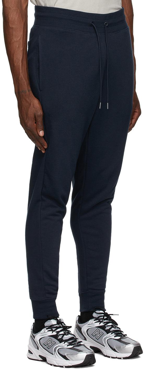 Slim-fit French terry lounge pants in navy. Mid-rise. Three-pocket styling. Drawstring at rib knit elasticized waistband. Logo embroidered in white and yellow at front. Logo patch in red at back pocket. Rib knit cuffs. Supplier color: Eclipse Body: 60% cotton, 40% polyester. Trim: 67% cotton, 28% polyester, 5% spandex. Brand: New Balance