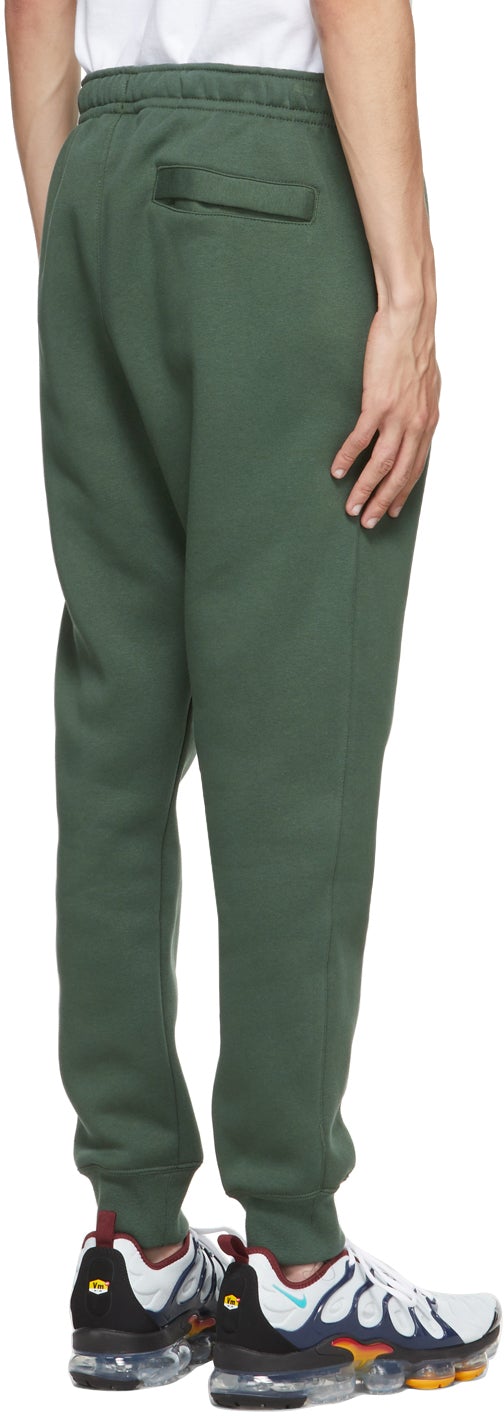 Relaxed-fit cotton-blend fleece lounge pants in green. Mid-rise. Three-pocket styling. Concealed drawstring at elasticized waistband. Swoosh and logo embroidered in white at front leg. Rib knit cuffs. Supplier color: Galactic 80% cotton, 20% polyester. Brand: Nike