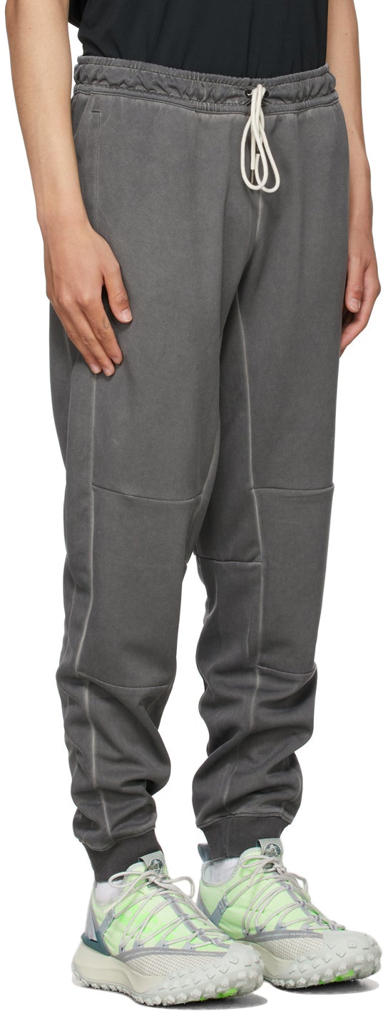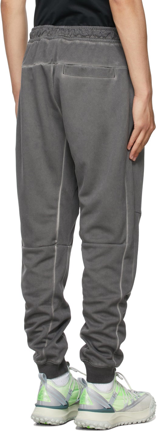 Tapered technical jersey lounge pants in grey. Mid-rise. Fading throughout. Three-pocket styling. Drawstring in white at elasticized waistband. Tonal logo embroidered at front. Rib knit elasticized cuffs. Supplier color: Black/Black 100% polyester. Brand: Nike