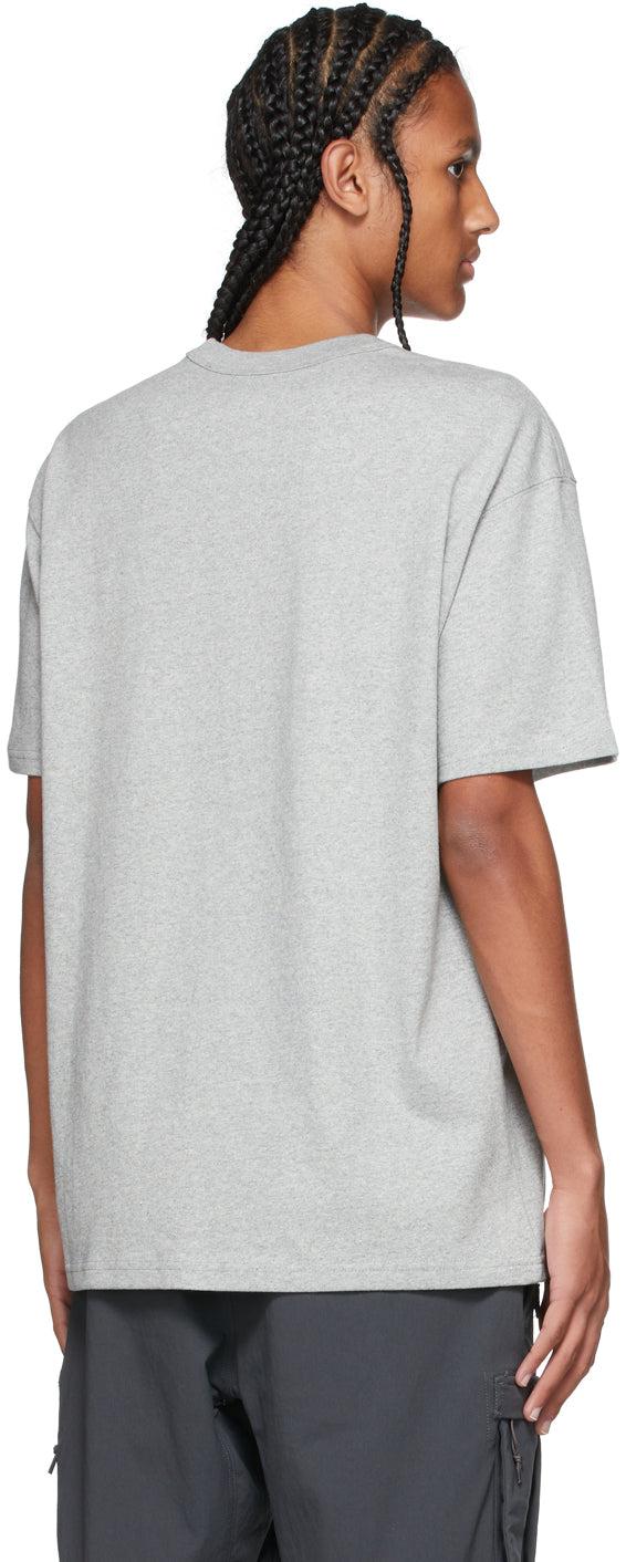 Short sleeve heavyweight cotton jersey T-shirt in heather grey. Rib knit crewneck collar. Tonal logo and Swoosh embroidered at chest. Dropped shoulders. Textile logo flag in black at side-seam. Supplier color: Dark grey heather 100% cotton. Brand: Nike