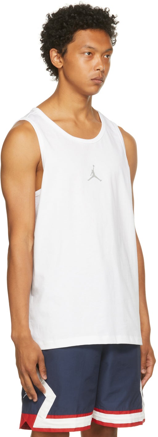 Sleeveless cotton jersey tank top in white. Rib knit scoop neck collar and armscyes. Bonded logo in grey at chest and back. Supplier color: White 100% cotton. Brand: Nike Jordan
