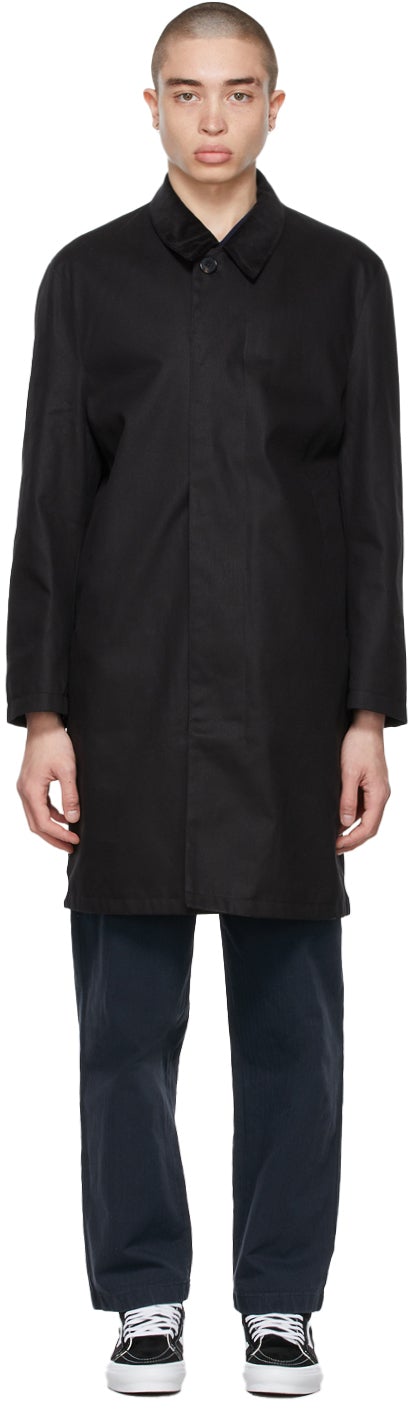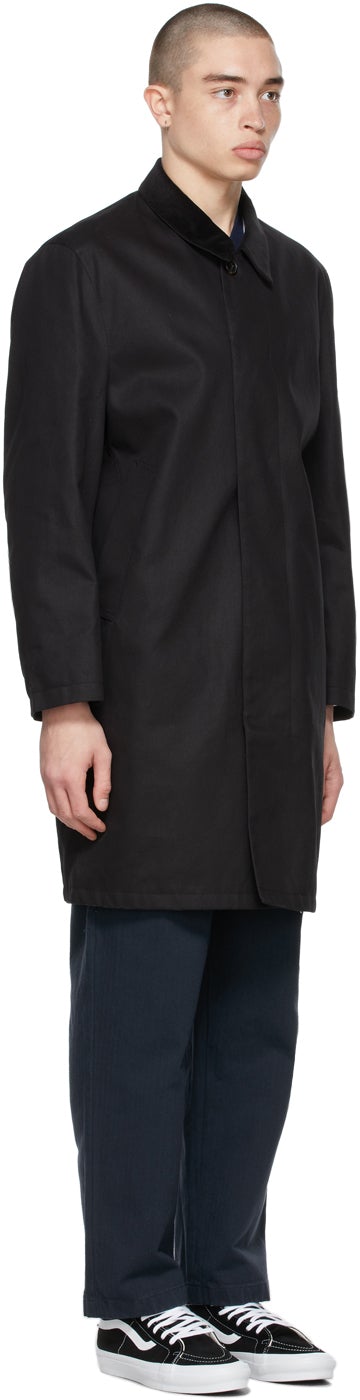 Long sleeve wind and water-resistant coated cotton twill coat in black. Corduroy spread collar. Concealed button closure at front. Welt pockets at waist. Eyelet vents at armscyes. Central vent at back hem. Patch pocket and textile logo patch at interior. Tonal cotton lining featuring check pattern in blue, yellow, and grey. Fully lined. Tonal and gold-tone hardware. Supplier color: Black 100% cotton. Brand: Noah