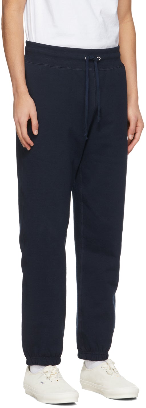Tapered 12 oz. cotton fleece sweatpants in navy. Mid-rise. Three-pocket styling. Drawstring at elasticized waistband. Logo embroidered in white and red at front. Elasticized cuffs. Silver-tone hardware. Supplier color: Navy 100% cotton. Brand: Noah