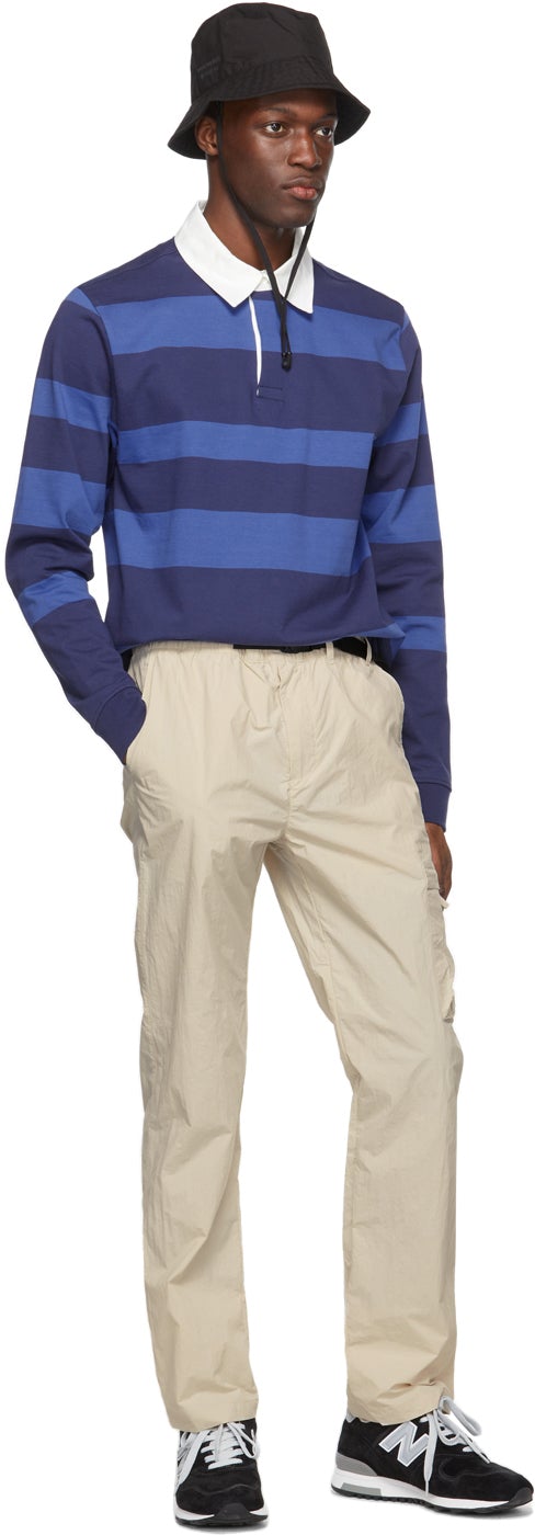 Packable straight-leg crinkled nylon taffeta cargo pants in beige. Mid-rise. Three-pocket styling. Integrated webbing belt in black featuring Duraflex buckle with tab-slot fastening and belt loops at elasticized waistband. Embroidered eyelets and zippered pocket at outseam. Darts and tonal embroidered logo at back waist. Zip-fly. Black and beige hardware. Supplier color: Oatmeal 100% nylon. Brand: Norse Projects