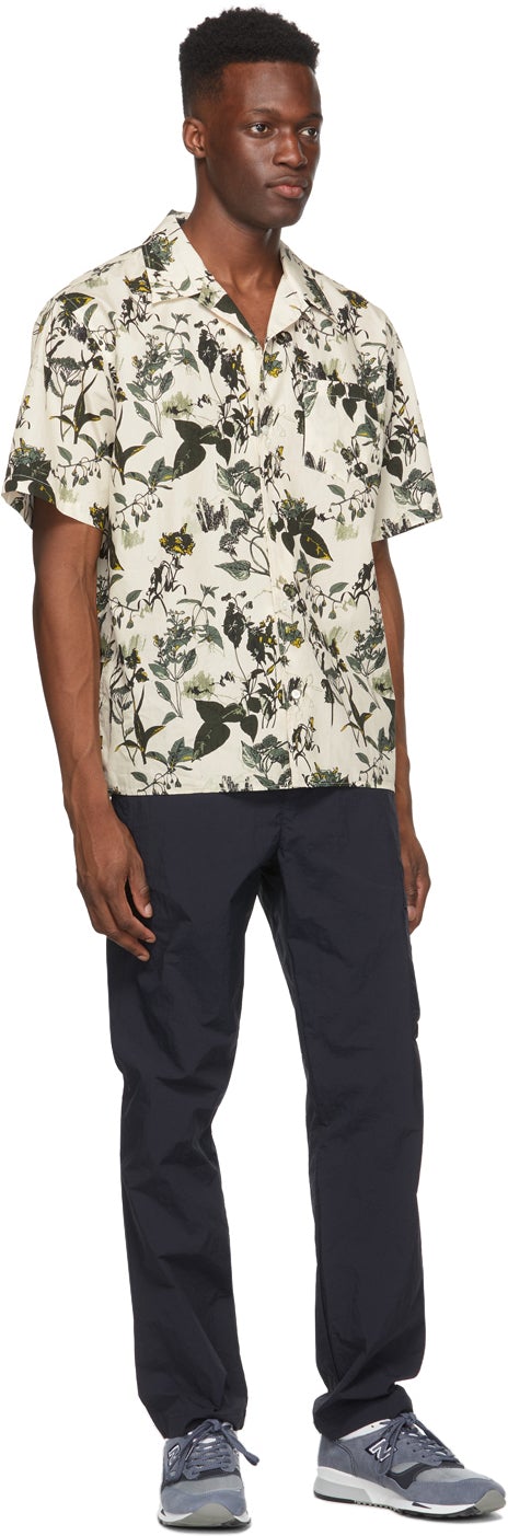 Packable straight-leg crinkled nylon taffeta cargo pants in navy. Mid-rise. Three-pocket styling. Integrated webbing belt in black featuring Duraflex buckle with tab-slot fastening and belt loops at elasticized waistband. Embroidered eyelets and zippered pocket at outseam. Darts and tonal embroidered logo at back waist. Zip-fly. Supplier color: Dark navy 100% nylon. Brand: Norse Projects