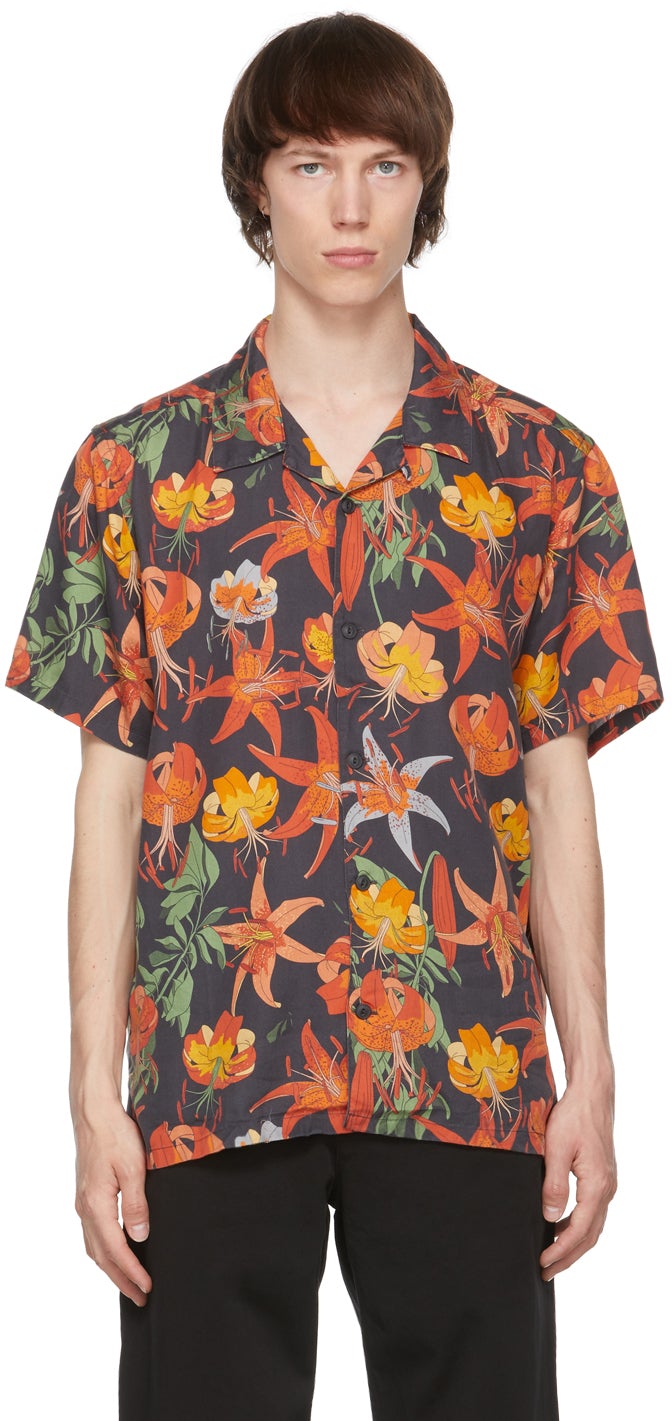 Short sleeve tencel twill shirt in soft black featuring graphic pattern printed in tones of red, orange, and green. Open spread collar. Button closure at front. Vented side-seams. Tonal hardware. Supplier color: Black 100% tencel. Brand: Nudie Jeans
