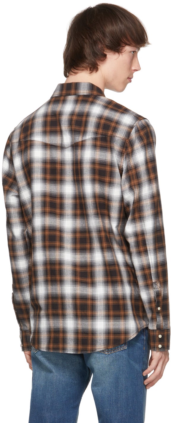 Long sleeve organic cotton twill shirt in brown featuring check pattern in black, grey, and white. Spread collar. Button closure at front. Flap pockets at chest. Two-button barrel cuffs. Beige hardware. Supplier color: Multi 100% organic cotton. Brand: Nudie Jeans