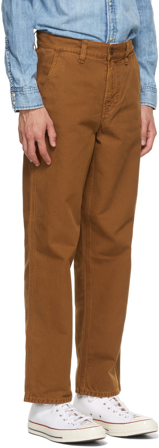 Straight-leg 10.2 oz. organic cotton twill trousers in brown. Mid-rise. Four-pocket styling. Belt loops at waistband. Textile logo patch in black and orange at back pocket. Zip-fly. Supplier color: Canvas cinnamon 100% cotton. Brand: Nudie Jeans