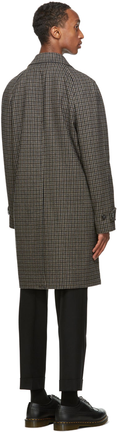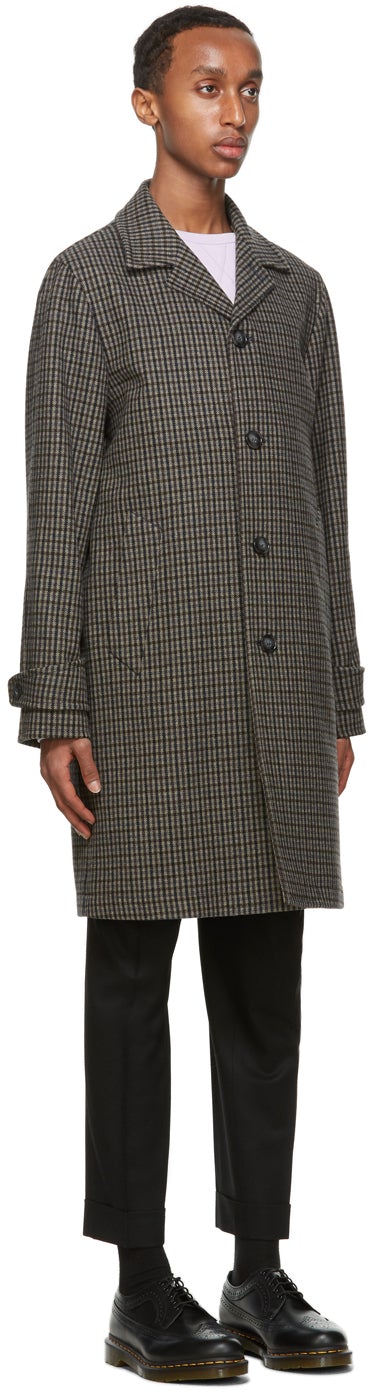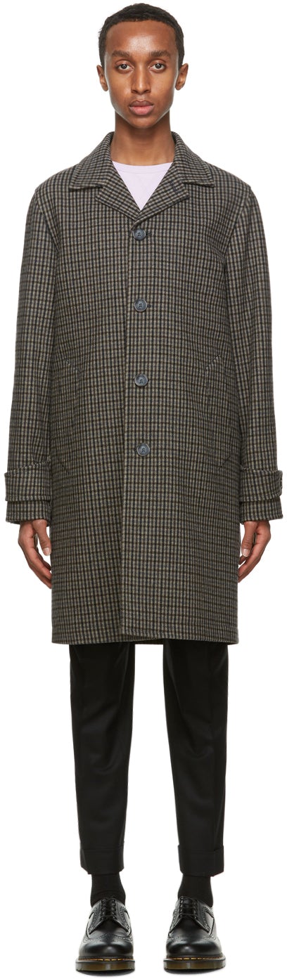 Long sleeve wool-blend coat featuring check pattern in tones of brown, beige, black, and navy. Notched lapel collar. Button closure at front. Welt pockets at waist. Adjustable button tabs at cuffs. Central vent at back hem. Welt pockets and patch pockets at interior. Fully lined. Supplier color: Beige/Black Body: 70% wool, 20% polyester, 10% polyamide. Trim: 100% cotton. Lining: 100% viscose. Brand: Officine Générale