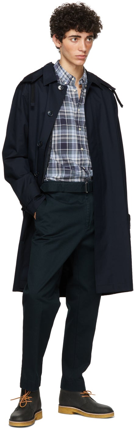 Tapered cotton twill trousers in navy. Mid-rise. Four-pocket styling. Belt loops at waistband. Detachable and adjustable cinch belt at waistband. Central creases at front and back. Zip-fly. Silver-tone hardware. Supplier color: Navy 100% cotton. Brand: Officine Générale
