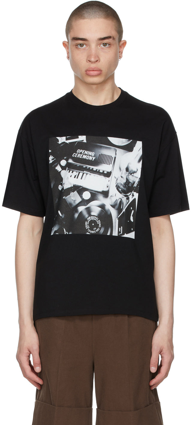 Short sleeve cotton jersey T-shirt in black. Rib knit crewneck collar. Graphic printed in black and white at front. Dropped shoulders. Logo printed in white at back collar. Supplier color: Black 100% cotton. Brand: Opening Ceremony