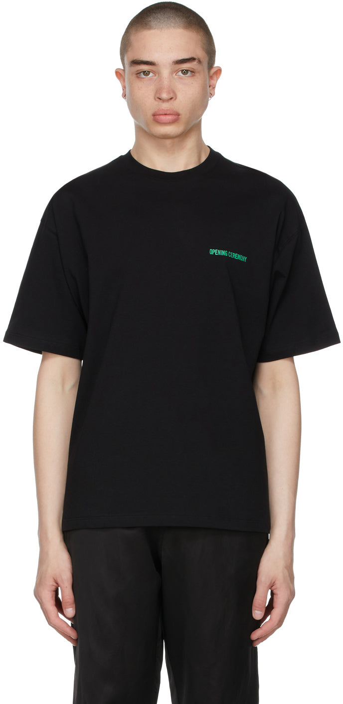 Short sleeve cotton jersey T-shirt in black. Rib knit crewneck collar. Logo printed in green at chest. Dropped shoulders. Graphic, text, and logo printed in multicolor at back. Supplier color: Black 100% cotton. Brand: Opening Ceremony