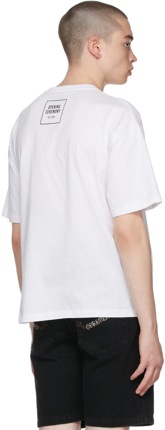 Short sleeve cotton jersey T-shirt in white. Rib knit crewneck collar. Graphic printed in multicolor at front. Dropped shoulders. Logo printed in black at back collar. Supplier color: White/Multicolor 100% cotton. Brand: Opening Ceremony