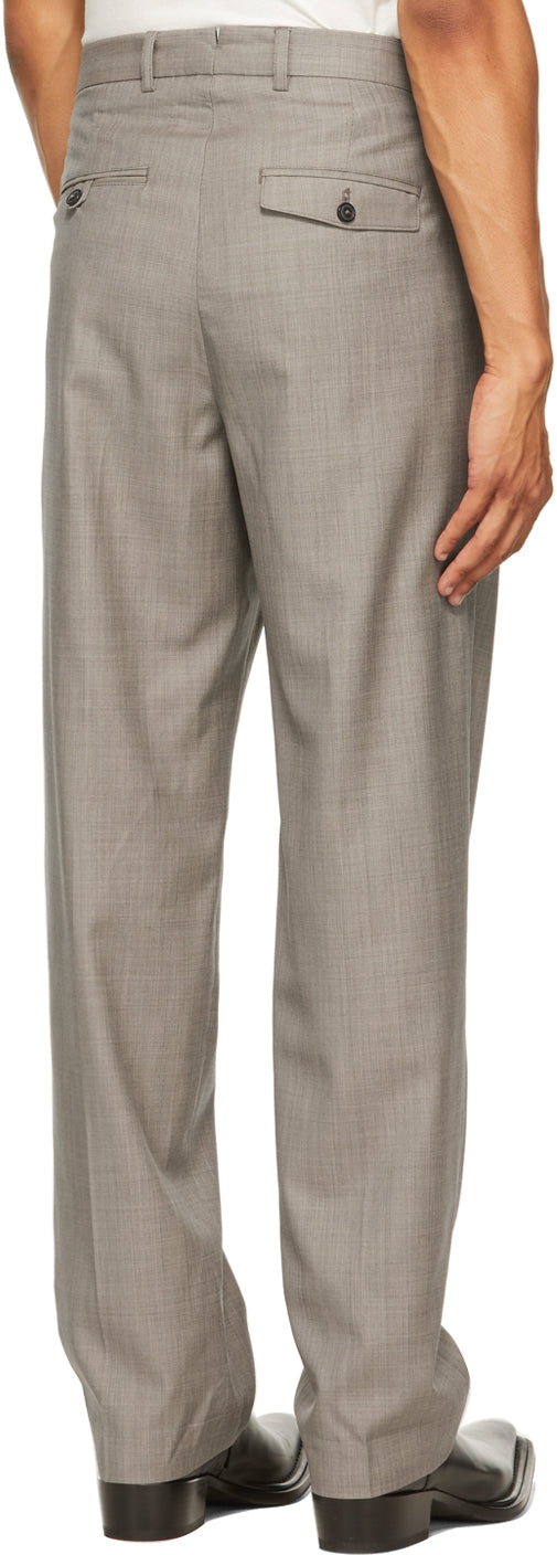 Straight-leg worsted virgin wool trousers in taupe featuring tonal check pattern. Mid-rise. Four-pocket styling. Belt loops at waistband. Central crease at front legs. Zip-fly. Black hardware. Supplier color: Stone grey Body: 100% virgin wool. Trim: 100% cotton. Brand: Our Legacy