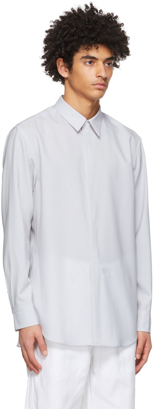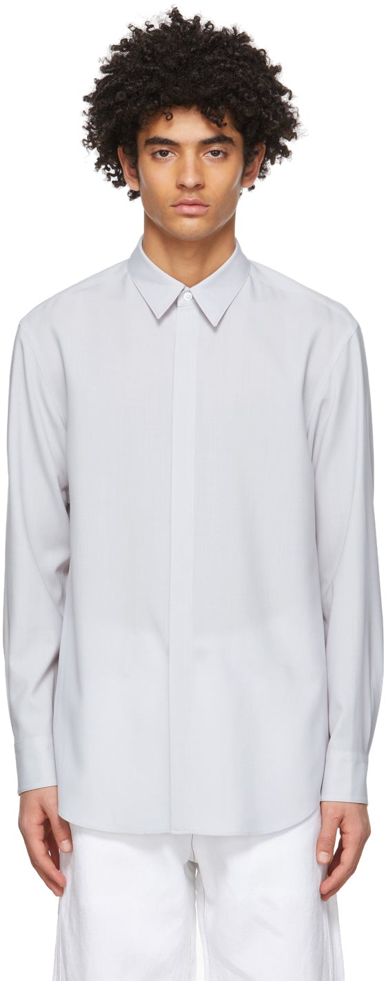 Long sleeve plain-woven wool shirt in grey. Spread collar. Concealed button closure at front. Pleats at two-button barrel cuffs. Shirttail hem. Mother-of-pearl hardware. Supplier color: Lilac 100% wool. Brand: OVERCOAT