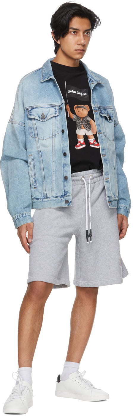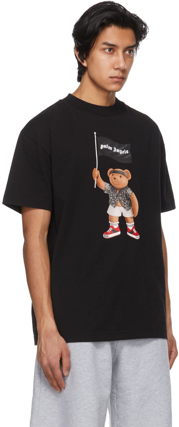 Short sleeve cotton jersey T-shirt in black. Rib knit crewneck collar. Graphic and logo printed in tones of brown, black, white, and red at front. Dropped shoulders. Textile logo flag at side-seam. Supplier color: Black/White 100% cotton. Brand: Palm Angels