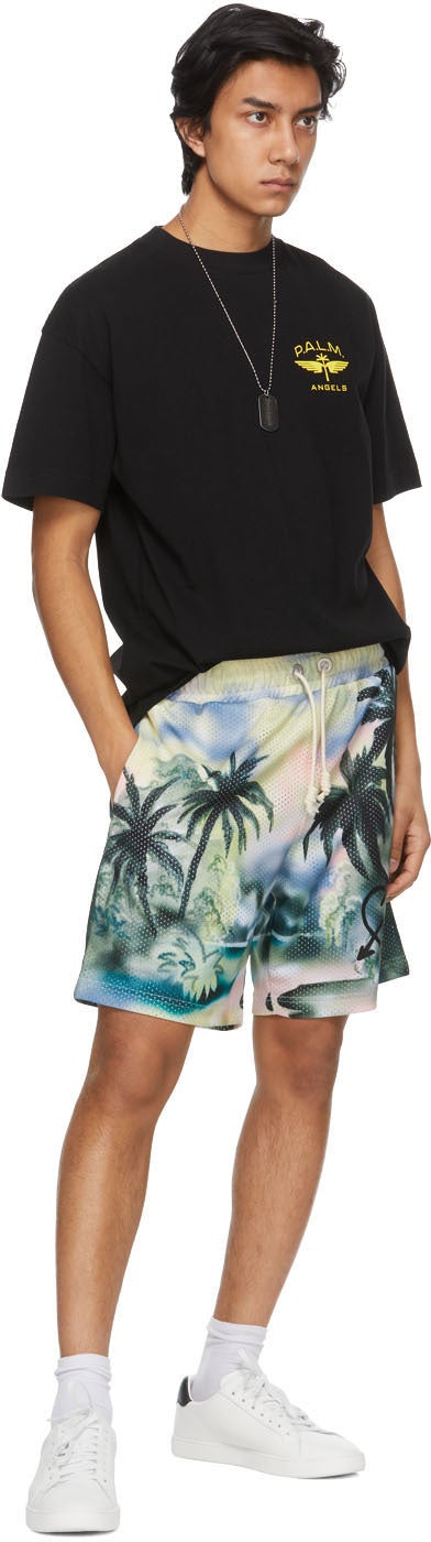Short sleeve cotton jersey T-shirt in black. Rib knit crewneck collar. Logo and graphic printed in yellow at chest and back. Textile logo flag at side-seam. Dropped shoulders. Supplier color: Black 100% cotton. Brand: Palm Angels