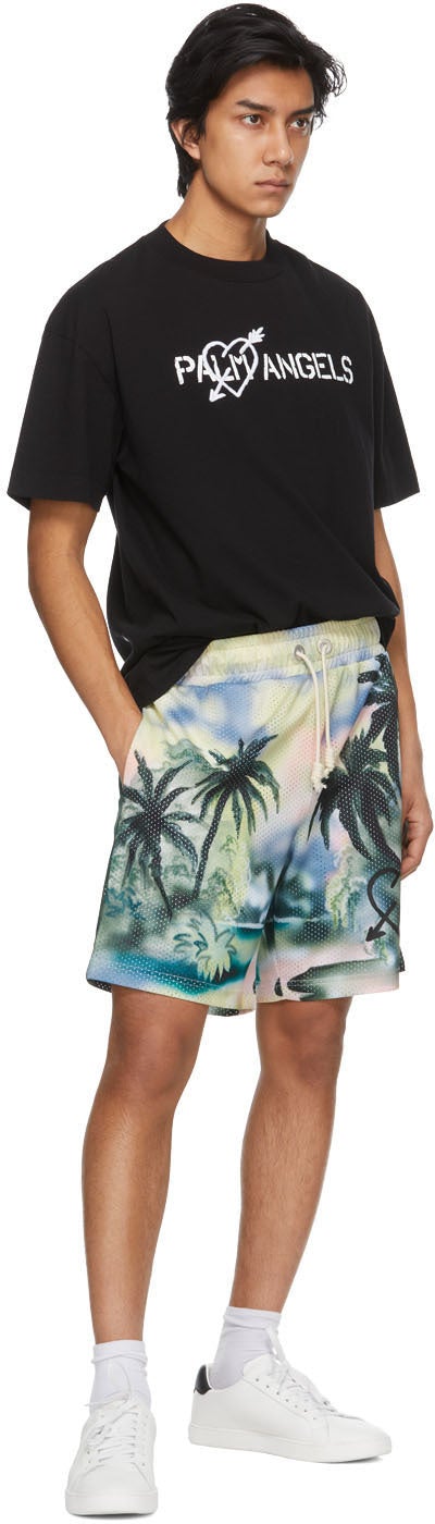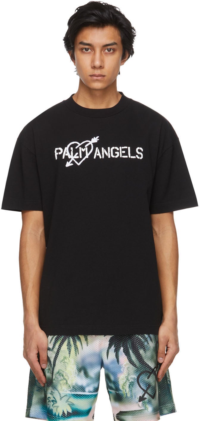 Short sleeve cotton jersey T-shirt in black. Rib knit crewneck collar. Logo printed and graphic embroidered in white at front. Dropped shoulders. Supplier color: Black/White 100% cotton. Brand: Palm Angels