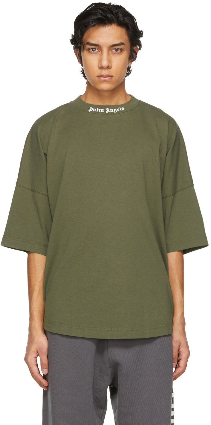 Short sleeve cotton jersey T-shirt in khaki. Logo printed in white at rib knit mock neck collar and back. Dropped shoulders. Supplier color: Military/White 100% cotton. Brand: Palm Angels