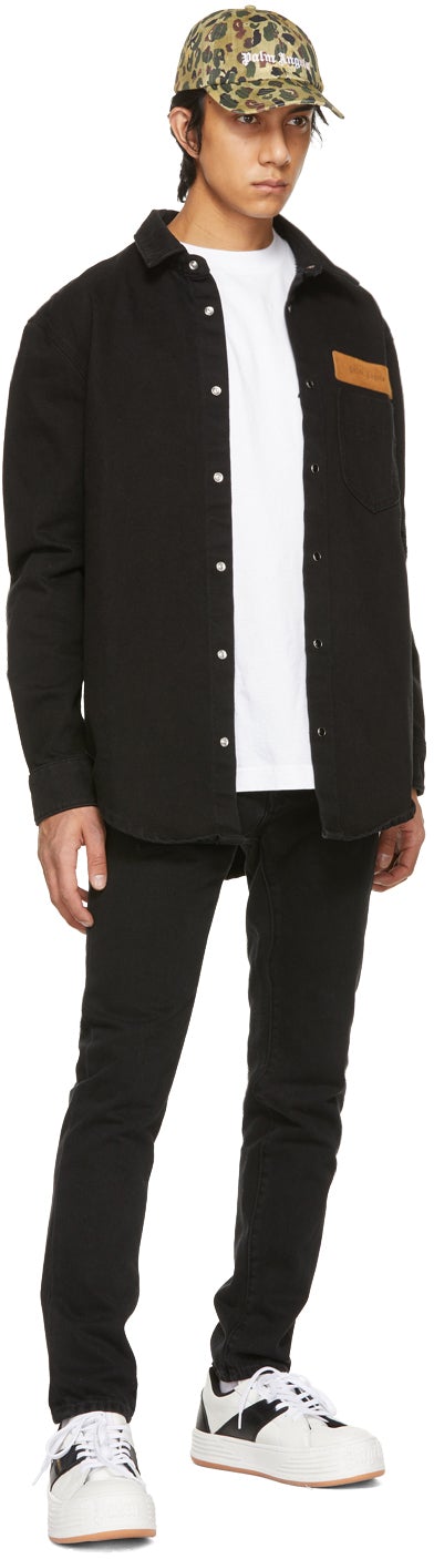 Short sleeve cotton jersey T-shirt in white. Rib knit crewneck collar. Printed logo and embroidered graphic in white, yellow, and black and front and back. Dropped shoulders. Supplier color: White/Black 100% cotton. Brand: Palm Angels