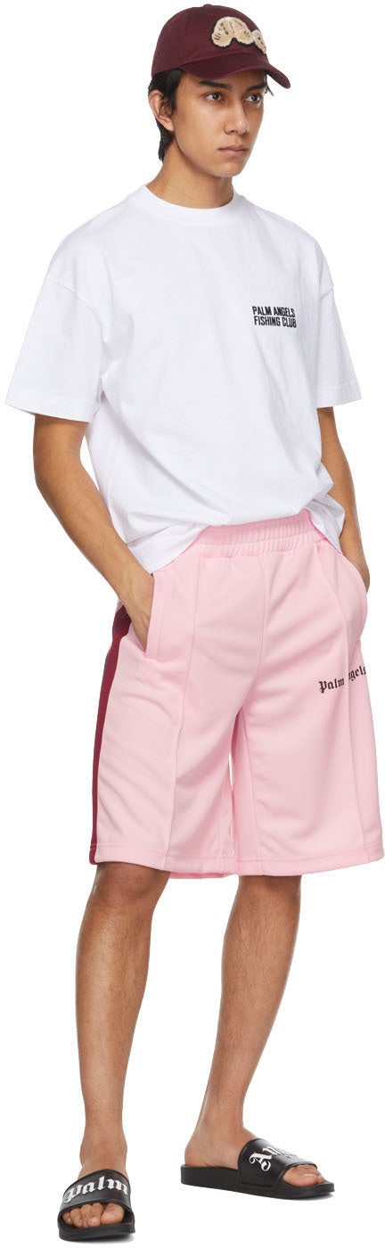 Short sleeve cotton jersey T-shirt in white. Rib knit crewneck collar. Logo and text embroidered in black at chest. Multicolor graphic printed at back. Textile logo flag in black at side-seam. Supplier color: White 100% cotton. Brand: Palm Angels