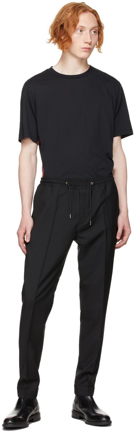 Short sleeve organic cotton jersey T-shirt in black. Rib knit crewneck collar. Webbing trim featuring signature multicolor stripe pattern at side-seams. Logo bonded in white at back collar. Supplier color: Black 100% organic cotton. Brand: Paul Smith